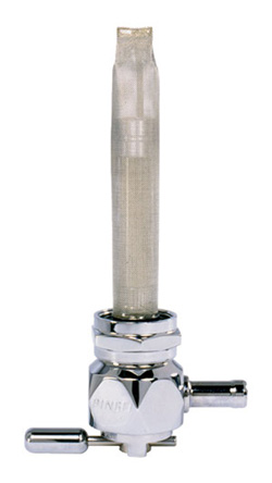 Power-Flo Single Outlet Reserve Fuel Valve. 22mm (H-D) Inlet. 6000 Series. 5/16" hose barb. Chrome finish. Diamond Hex design. Includes adapter nut.